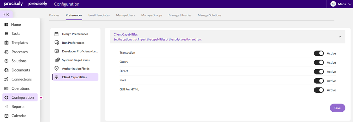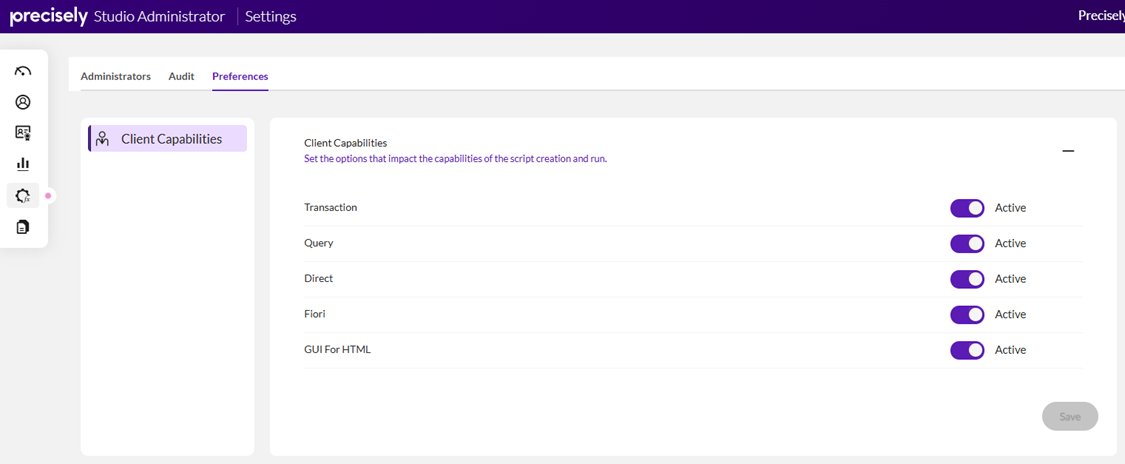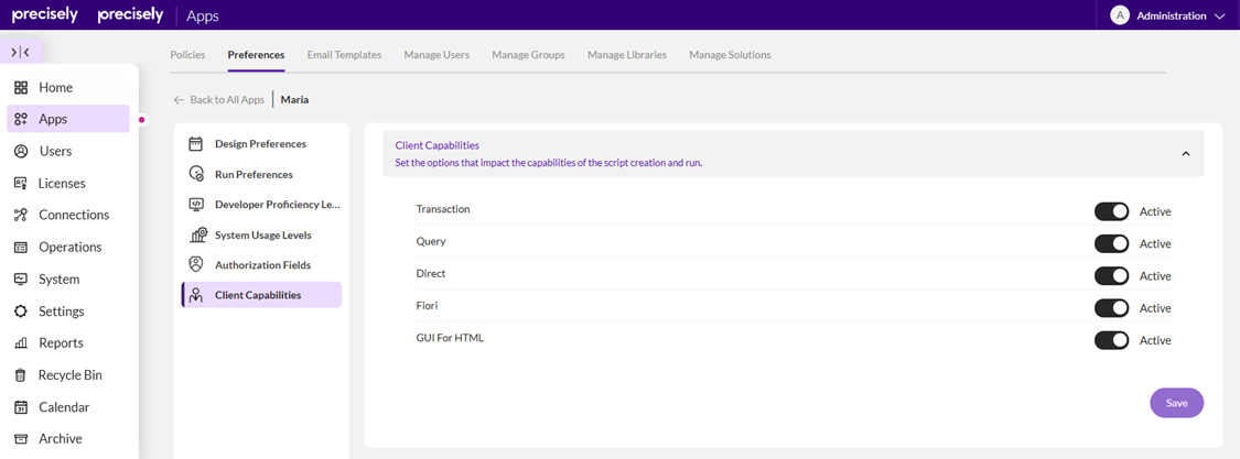 From the Administration app in Studio Manager or Evolve, go to "Apps" in the left menu, find the app you want to make changes to, under the "Actions" column select "Configurations". You will now see the configuration options for that app. Select the "Preferences" tab on top and choose "Client Capabilities". Please note this is a local setting so it affects all users in that app.