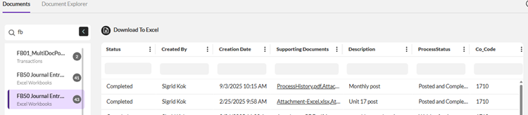 · Optionally check Display on Documents Page, where you will see the Excel documents that are part of the process columns available for display, like below.